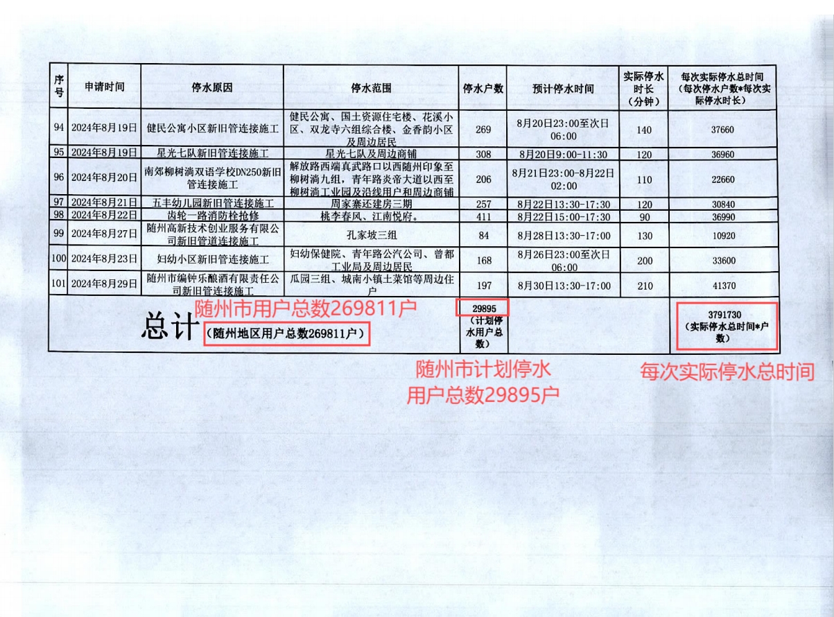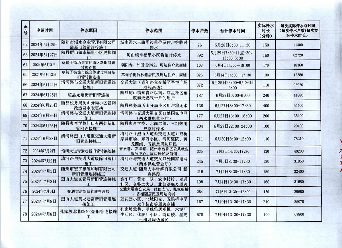 隨州市2023年9月至2024年8月計(jì)劃性停水資料