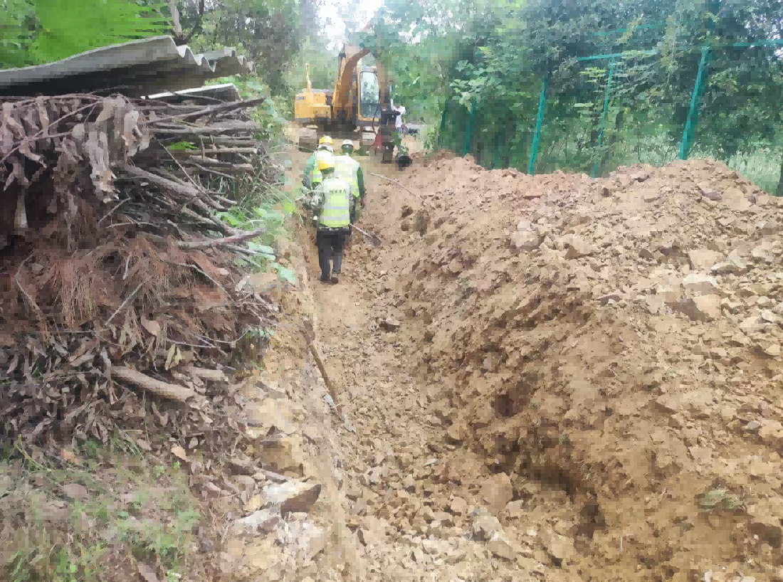 機電學校DN250球墨管供水工程線路處于山地丘陵地帶,沿線涉及鄉(xiāng)村道路、開墾菜園、陡峭山體等多重地質(zhì)和復(fù)雜環(huán)境考驗。在沿機電學校圍墻邊緣鋪設(shè)段,鄉(xiāng)村道路與圍墻之間不足3米的狹窄空間,成為施工線路上的“攔路虎”,該道路是周邊居民日常出行的主要通道,一旦長時間阻斷,將嚴重影響群眾生活。項目部與學校和村委共同研討下,最終確定利用2天時間,集中突擊,調(diào)用多臺設(shè)備,全力沖刺,快速施工完成后復(fù)路于民,順利啃下硬骨頭。