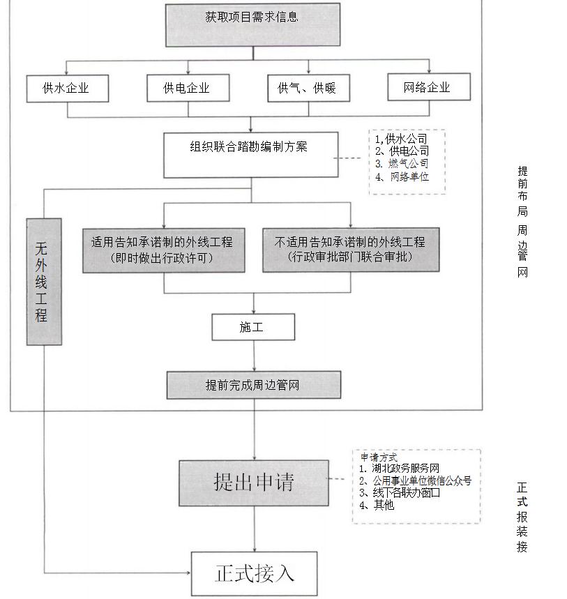 ( 一) 一 口登記早服務(wù)。 新建投資項目在土地出讓階段, 隨同填寫《用戶獲得水、電、氣、網(wǎng)、暖需求信息采集單》, 對新建項目施工和生產(chǎn)所需的用水、用電、用氣、用網(wǎng)、用暖 需求進行意向登記。將項目報裝需求通過湖北政務(wù)服務(wù)網(wǎng)、工 改平臺傳遞給各公用事業(yè)單位,公用事業(yè)單位聯(lián)合上門對接, 根據(jù)用戶需求提前布局項目周邊區(qū)域管網(wǎng),為用戶后續(xù)獲得水、電、氣、網(wǎng)、暖接入作好準備。